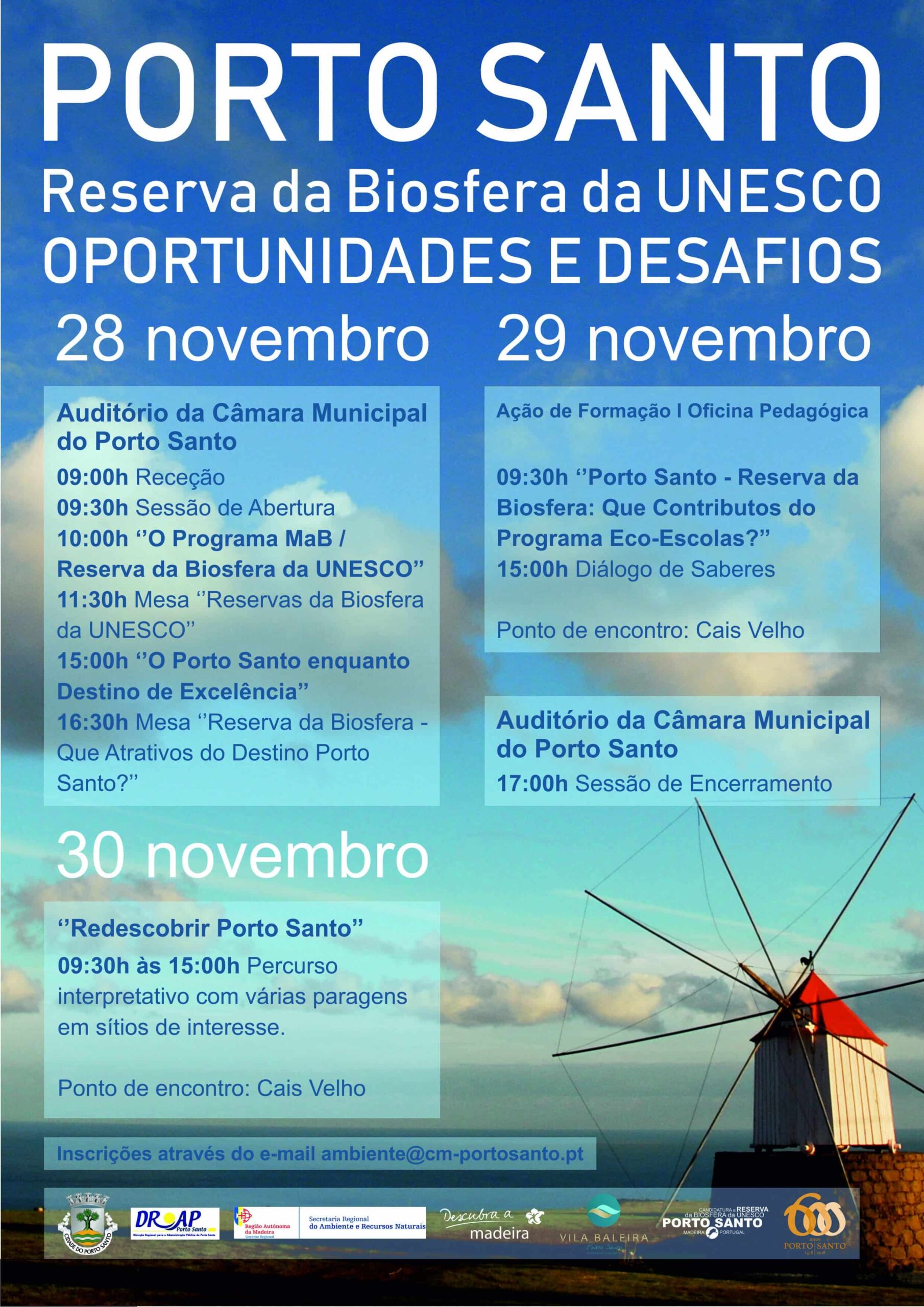 No âmbito da candidatura do Porto Santo a Reserva da Biosfera, realizar-se-á nos próximos dias 28, 29 e 30 de novembro o evento “Porto Santo – Reserva da Biosfera da UNESCO: Oportunidades e Desafios”. Esta iniciativa dirige-se ao público em geral e tem como objetivo dar a conhecer este galardão da UNESCO e elucidar sobre a forma deste poder contribuir para a promoção dos seus valores naturais e patrimoniais na procura do desenvolvimento da economia local baseada no turismo sustentável.