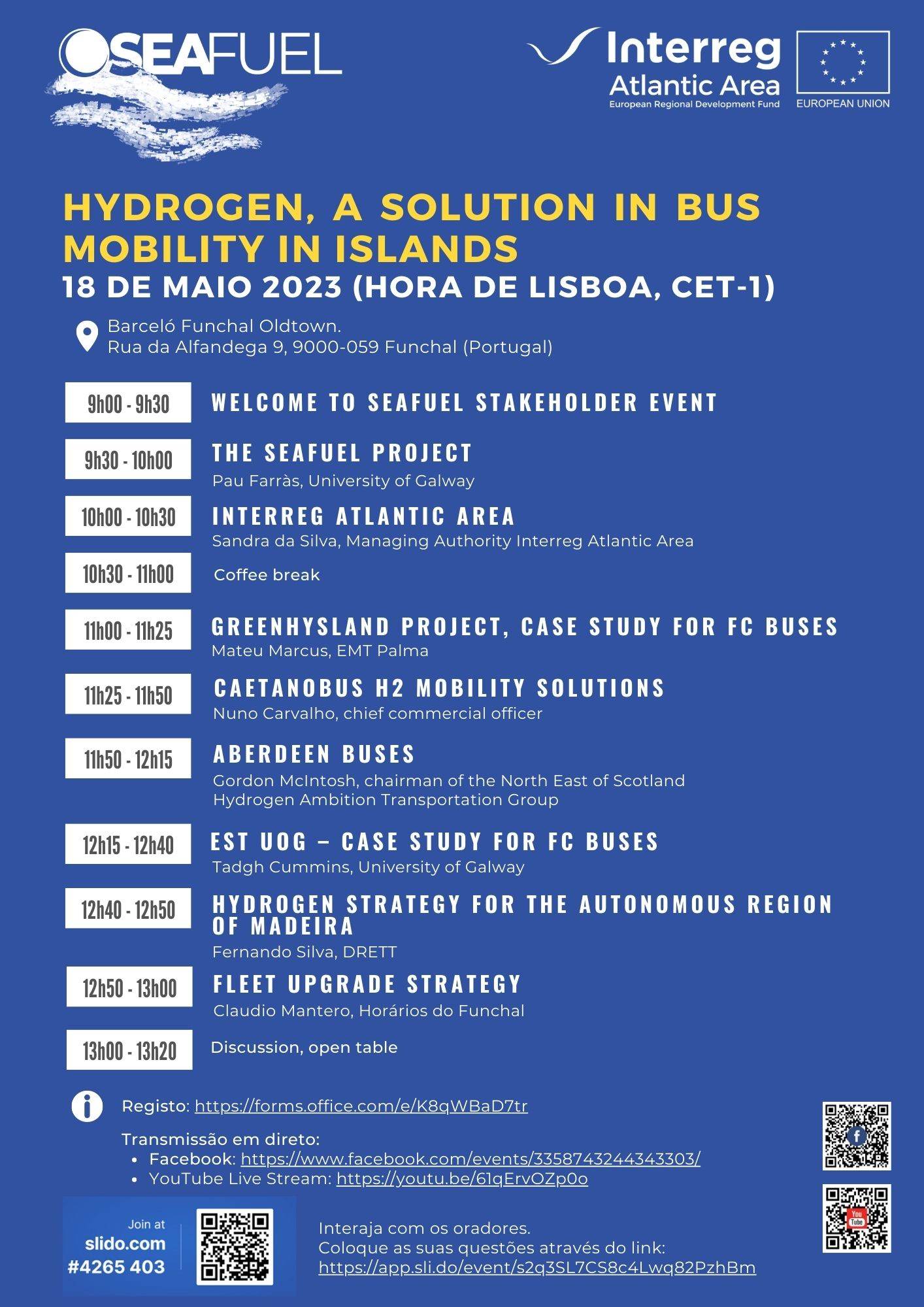 É já no próximo dia 18 de maio que se realizará o seminário “Hydrogen, a solution in bus mobility in islands”, no âmbito do projeto SEAFUEL. Com início às 09h (hora local) – 10h CET – poderá assistir ao seminário ao vivo no hotel Barceló Funchal Oldtown, ou através das redes sociais da AREAM e do projeto SEAFUEL.