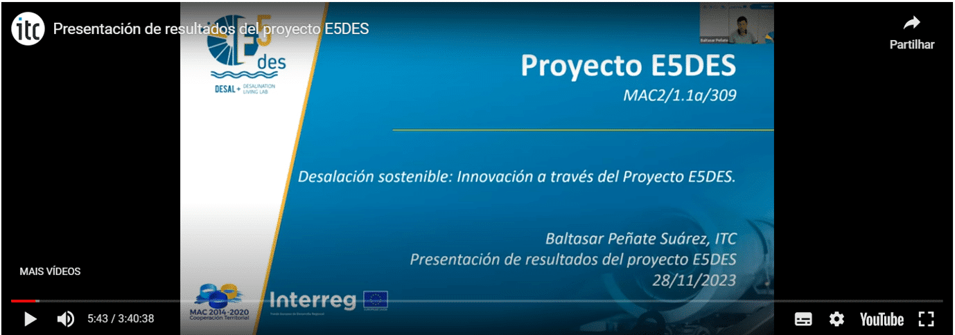 No passado dia 28 de novembro, o projeto E5DES apresentou os principais resultados atingidos após 4 anos de trabalho. O evento de apresentação de resultados foi realizado em formato online com tradução simultânea para espanhol, francês e português, servindo desta forma como plataforma para disseminar como E5DES respondeu aos atuais desafios e necessidades no âmbito da dessalinização.
